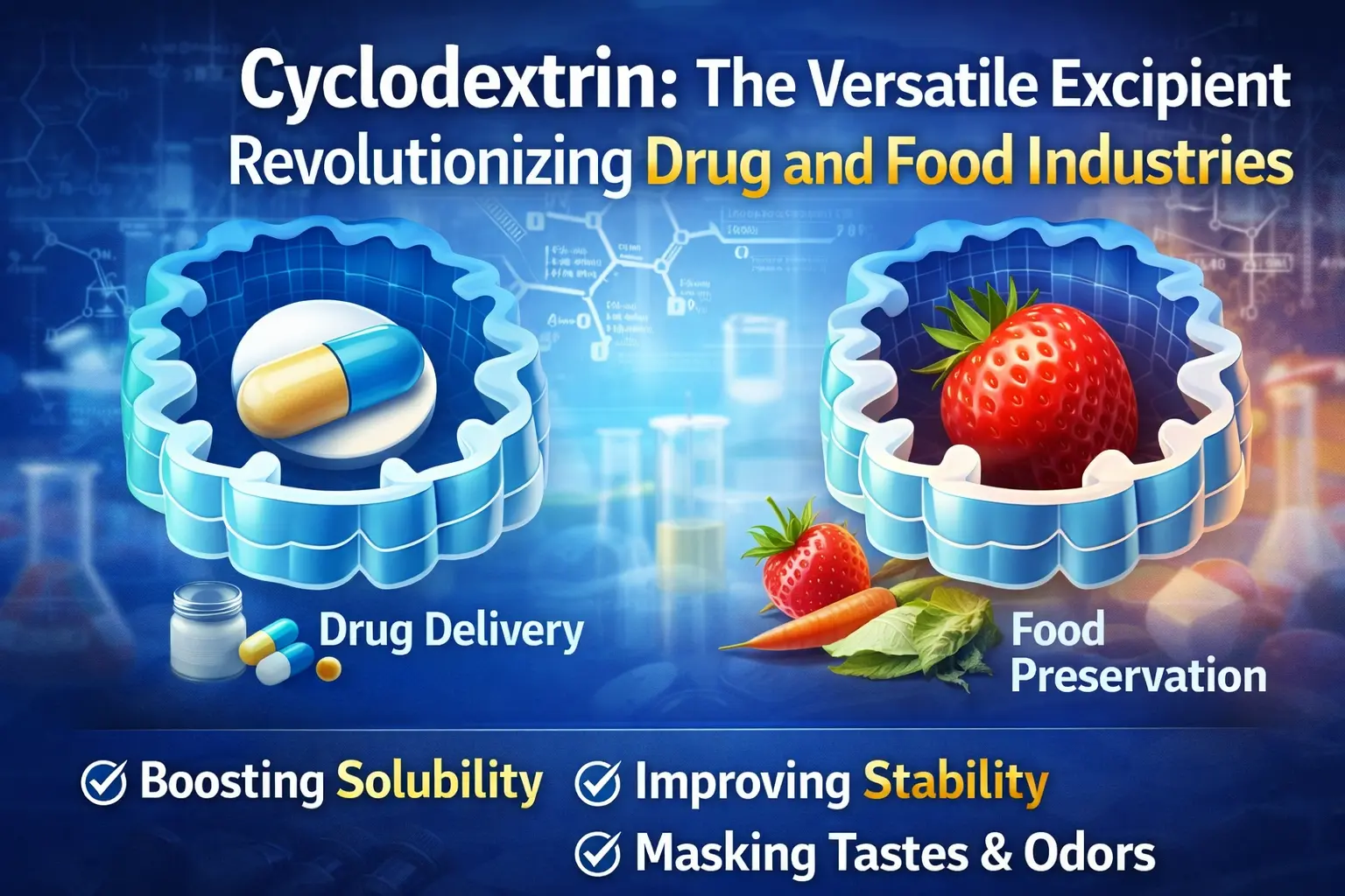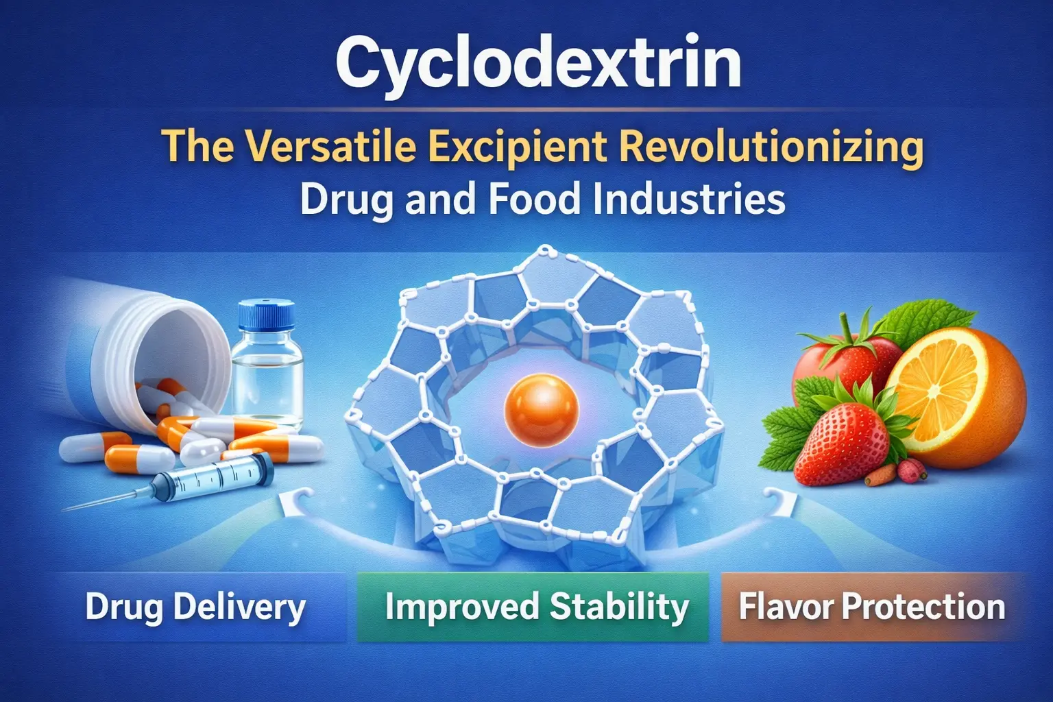 A ciklodextrin felfedezése az egyik legfontosabb előrelépés az élelmiszer- és orvostudomány történetében. Ez a természetesen előforduló ciklikus oligoszacharid megváltoztatta a gyógyszerek szállításának, az élelmiszerek frissen tartásának és sok más vegyi anyag ipari felhasználásának módját. A prudukt olyan zárványkomplexeket állít elő, amelyek számos területen megoldanak fontos problémákat jellegzetes molekulaszerkezetének köszönhetően, amely hidrofób belső üreggel és hidrofil külső felülettel rendelkezik. Ez a rugalmas segédanyag világszerte megváltoztatja a formulázási tudományt és a gyártási folyamatokat. Mindenre képes, a gyógyszerek felszívódásának javításától a rossz ízek elrejtéséig a gyógyszerekben.