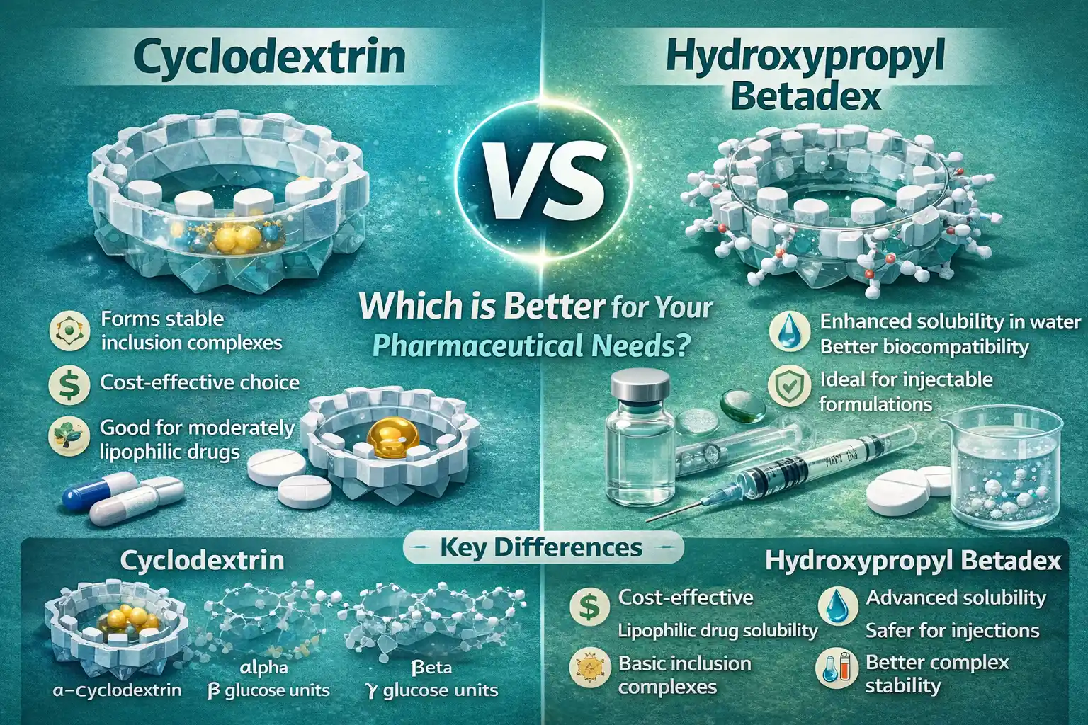 Ha gyógyszerészeti felhasználásról van szó, a ciklodextrin éshidroxipropil-betadexmindkettő jó a maga módján a gyógyszerbejuttatási módszerekhez. A standard ciklodextrinek jól bezárják a molekulákat, és költséghatékonyak. Másrészt a hidroxi-propil-betadex jobban oldódik vízben, és biokompatibilis. A választás a készítmény igényeitől függ, mivel a hidroxipropil-betadex fejlett oldhatóságjavítást biztosít a nehéz gyógyszermolekulák és a bázisos zárványkomplexekben kitűnő ciklodextrinek számára.