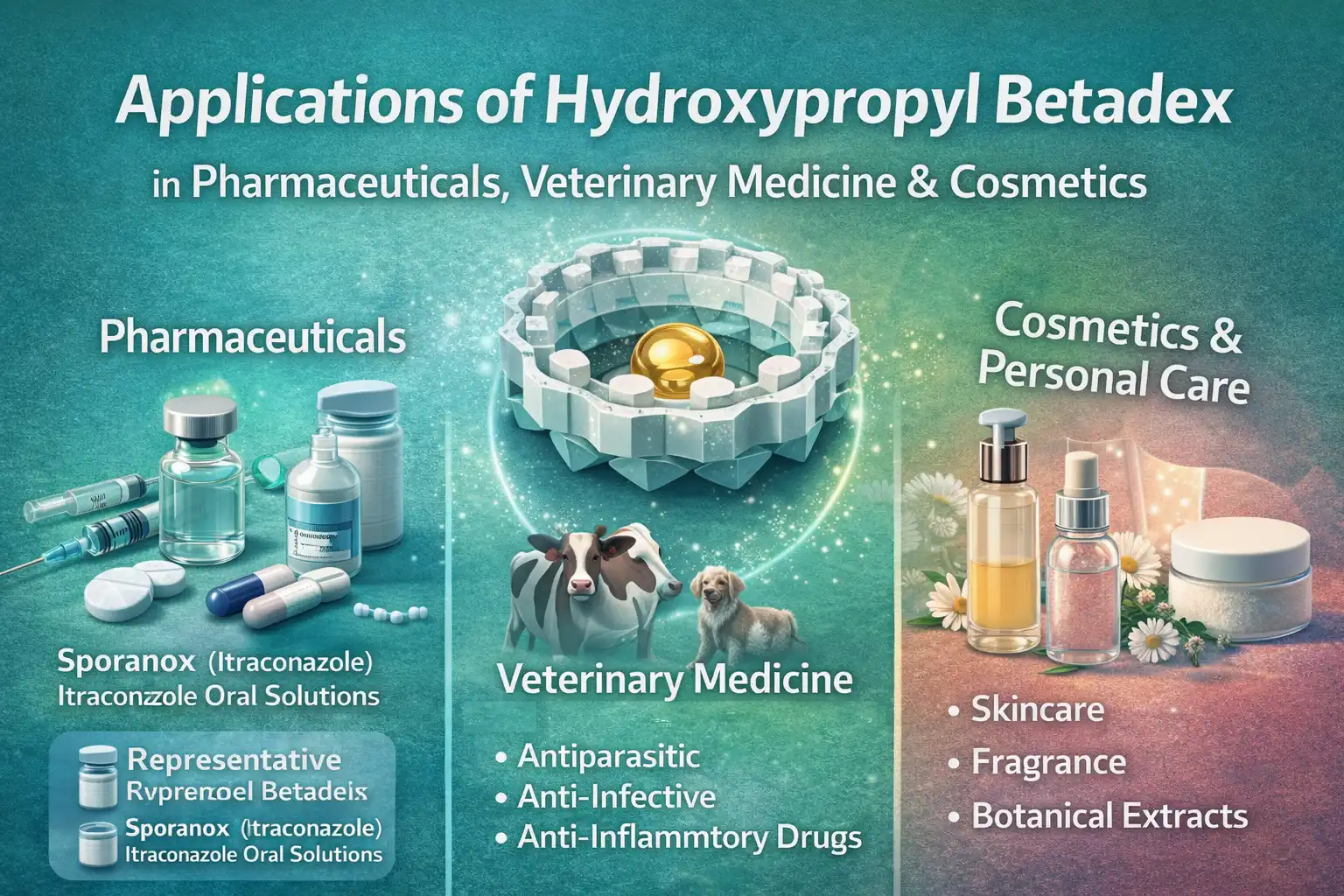 Az állatgyógyászatban a Hydroxypropyl Betadex-et a rosszul oldódó parazitaellenes, fertőzés- és gyulladáscsökkentő gyógyszerek teljesítményének javítására használják.