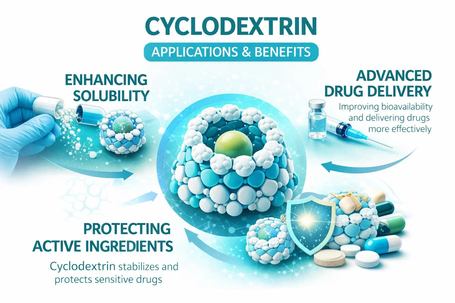 A ciklodextrin hozzáadásával a gyógyszerszállítási módszerek elképesztő módon megváltoztak. Ezek a molekulahordozók fontos problémákat oldanak meg a gyógyszerkészítés során, különösen, ha olyan vegyszerekről van szó, amelyek nem oldódnak jól vízben. Egy zárványkomplex létrehozása nagymértékben javítja a gyógyszerek felszívódását anélkül, hogy befolyásolná a kezelés hatékonyságát.