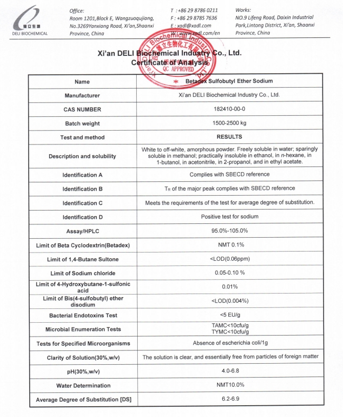 Az SBE-β-CD minden tételét szigorú minőségirányítási rendszer szerint gyártják, és átfogó analitikai vizsgálaton esnek át. Az olyan kulcsfontosságú minőségi paramétereket, mint a szennyeződések, endotoxinok, a helyettesítés mértéke és a tételenkénti konzisztencia szigorúan ellenőrzik.